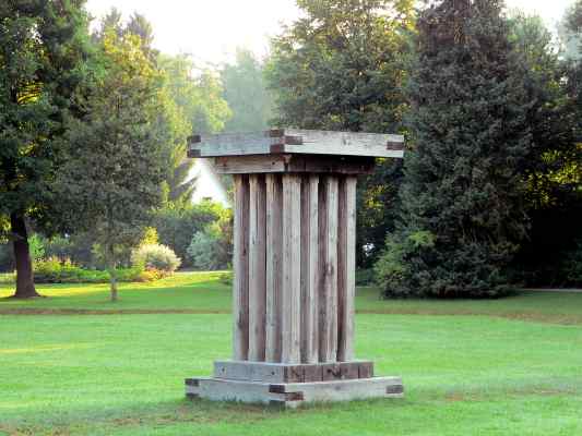 Aus Eichenbalken hat Roger Rigorth einen "Tempel" errichtet. Doch der Tempel ist nicht mehr begehbar. Sein Säulenpaket ist nur noch ein leeres Symbol für den Vorposten eines maroden römischen Reichs, der Blick des 21. Jahrhunderts auf weit zurückliegende Kulturen. Dennoch funktioniert die Chiffre. Roger Rigorths Tempel markiert so etwas wie einen heiligen Bezirk inmitten der modernen Kuranlagen.