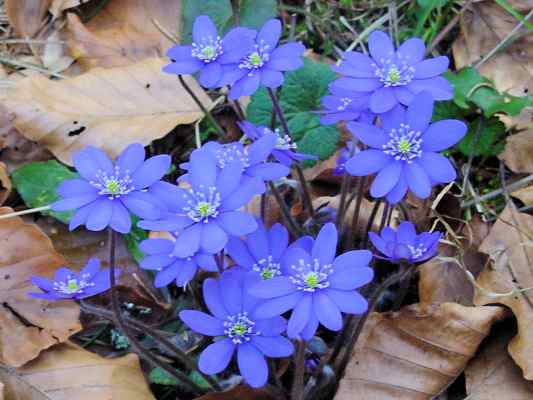 Beschreibung: Blüten einzeln, 2-3,5 cm im Durchmesser, blau, blauviolett, selten rotviolett. Alle Blätter grundständig, ledrig, überwinternd, 3lappig, oberseits grün und oft braunfleckig, unterseits oft rotbraun oder violett.