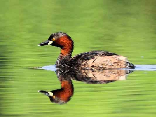 Duckentchen nennt der Volksmund den seltener gewordenen Zwergtaucher, den kleinsten Vertreter der Lappentaucher in Europa. Der geschickt wegtauchende Wasservogel fällt oft gar nicht auf, nur der hohe, im Duett von Männchen und Weibchen vorgetragene Triller verrät seine Anwesenheit im lockeren Röhricht oder am dicht bewachsenen Ufer kleinerer Flüsse. Bevorzugt brütet der Zwergtaucher auf kleinen, wasserpflanzenreichen Teichen. Dort taucht er wendig zwischen den Unterwasserpflanzen und sucht nach Insektenlarven oder Kleinfischen. Am "hohen Heck" ist er auch im Winterkleid vom nur wenig größeren Schwarzhalstaucher zu unterscheiden. Zur Brutzeit zeigen die Altvögel eine rostbraune Kehl- und Halsfärbung sowie einen hellgelben Fleck an der Schnabelwurzel. Ihre zunächst winzig wirkenden Jungen tragen sie manchmal auf dem Rücken. Im Herbst und Winter verlassen viele Zwergtaucher ihre Brutplätze und sammeln sich in lockereren Gruppen auf Flachwasserbereichen von Seen.